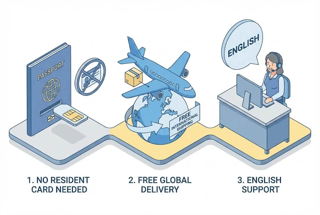 | Pre-arrival / Just Landed | ◎ (Best) | Free international shipping. No Residence Card needed for airport pickup. |