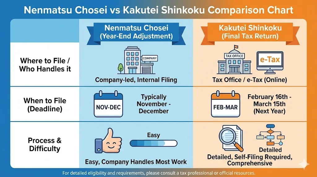 | Item | Nenmatsu Chosei (Year-End Adjustment) | Kakutei Shinkoku (Final Tax Return) |