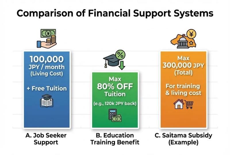 | A. Subsidio de Formación para Buscadores de Empleo | Buscadores de empleo (Sin seguro de desempleo) | 100.000 ¥ / mes + Ayuda transporte/alquiler | El mejor sistema: vas a la escuela gratis mientras recibes dinero para vivir. |